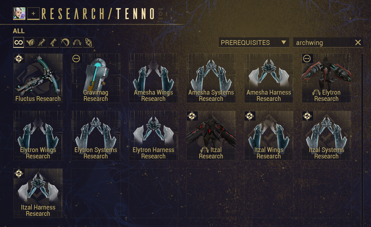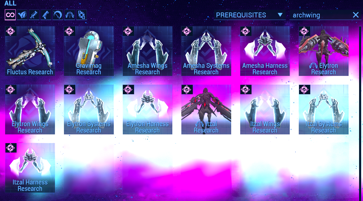 In the Emulator's Tenno Lab, if you search for Archwing, you receive the following results: