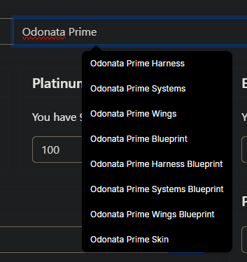 For example you cannot give yourself a non-BP Odonata Prime via Add Items. Only the parts are available in that list, not the crafted Archwing.