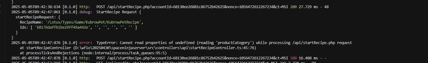 {"level":"error","message":"Error: unknown recipe /Lotus/Types/Game/KubrowPet/KubrowQuestPetRecipe while processing /api/startRecipe.php request\n at startRecipeController (xxx\src\controllers\api\startRecipeController.ts:28:15)\n at processTicksAndRejections (node:internal/process/task_queues:95:5)","timestamp":"2025-05-04T13:38:27.368Z","version":"0.1.0"}