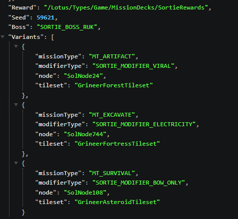 Seems like Sortie 2 is an unintended mess too. WorldState mentions Excavation, but that's also not a thing on Grineer Fortress tile. And the "Survival" mission on Asteroid that the WorldState mentions isn't showing up in-game either (though that tile and type should be fine normally I think).