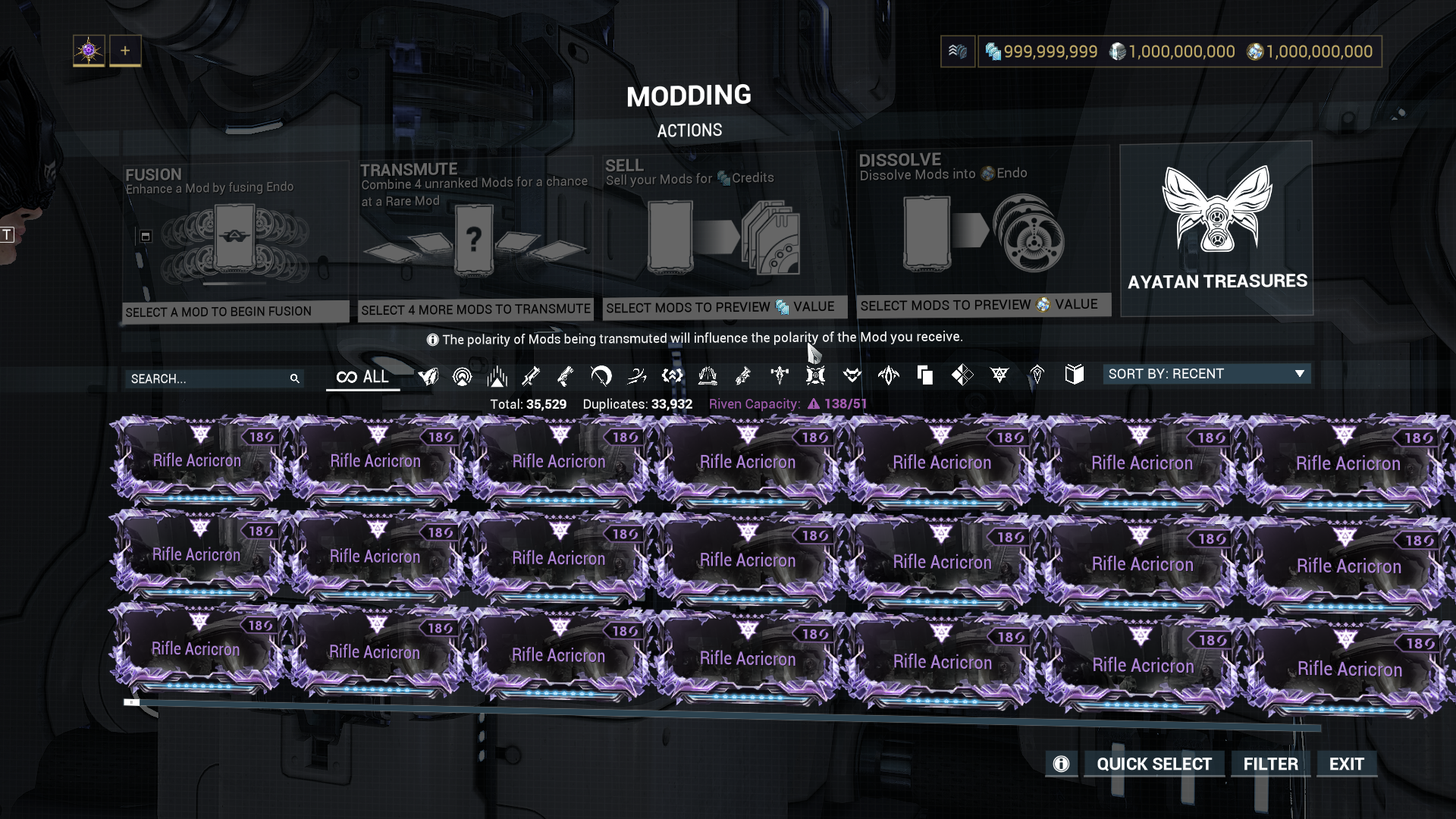 2025-05-12T09:28:35:499 [0.1.0] warn: inventory.RawUpgrades has a negative count for /Lotus/Upgrades/Mods/Randomized/LotusRifleRandomModRareIt says, with the new commit. Also I have been spamming the "Add" button at the Riven Mods section in WebUI, to add a lot of them at once. The error apparently seems to start showing up once I enter the modding thing in-game.