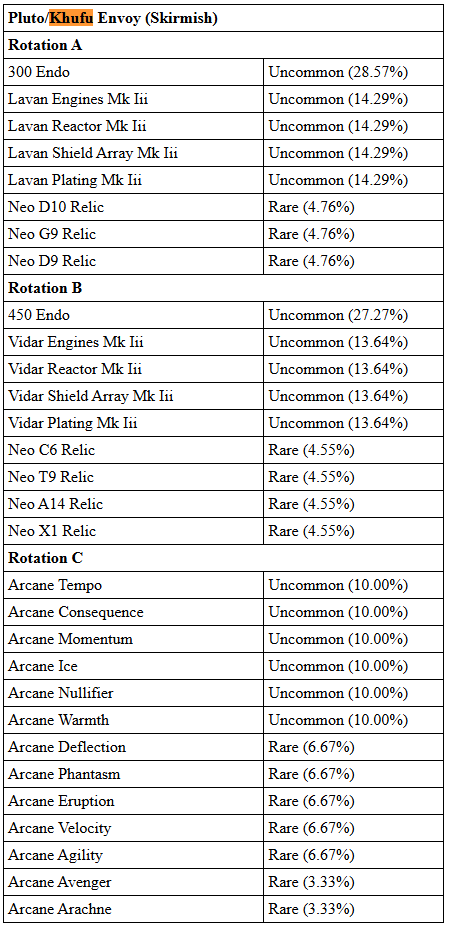 They do have reward tables officially, as they are present in the Drop Tables website from DE, under Pluto/Node Here (Skirmish).