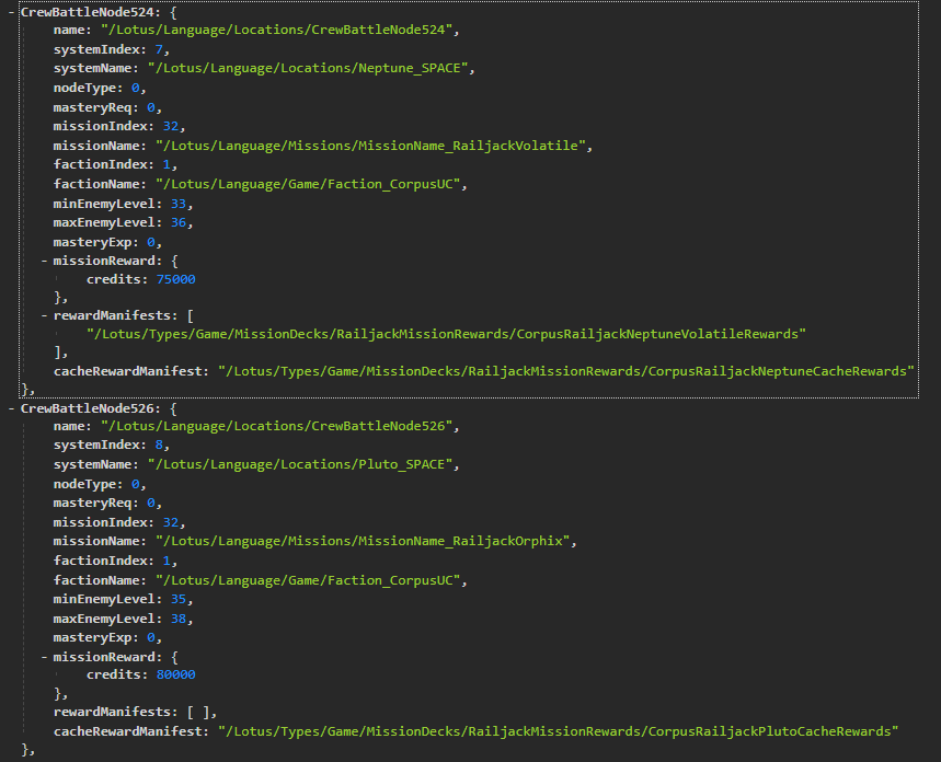 2025-08-03T02:11:54:436 [0.1.0] debug: Mission CrewBattleNode526 did not have Reward InfoThat was on Khufu Envoy, the Pluto Proxima Orphix Mission. Glancing at ExportRegions.json, it seems like most of the Pluto nodes are all missing their Reward Infos? And looking further into ExportRewards, it's... because those reward tables are missing too.