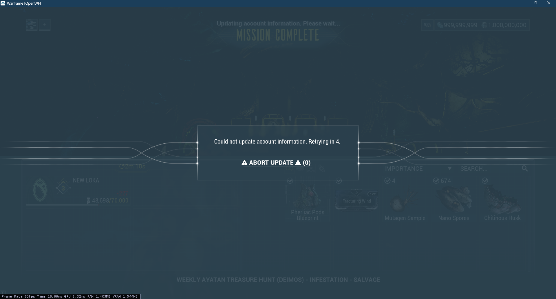 Upon completing Maroo's Ayatan Treasure hunt, the following is stuck in a loop on the server and the "Could not update account information. Retrying in 10." message on the client.